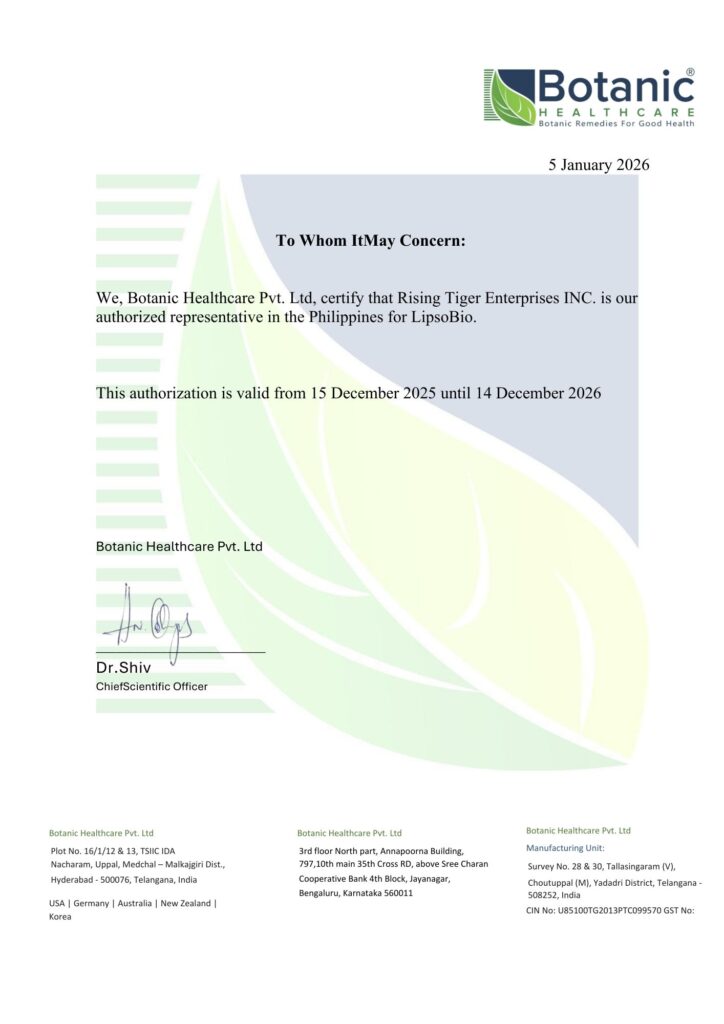We are pleased to formally announce that Rising Tiger Enterprises Inc. has been appointed by Botanic Healthcare Pvt. Ltd. as the authorized distributor of LipsoBio™ liposomal nutraceuticals. This appointment represents a strategic step in expanding access to innovative, science-backed nutraceutical solutions within the market.